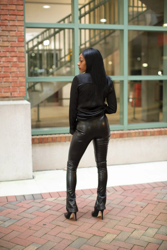 About the look: satin black button up shirt, vegan leather leggings, wool black coat, black leather bootie.
