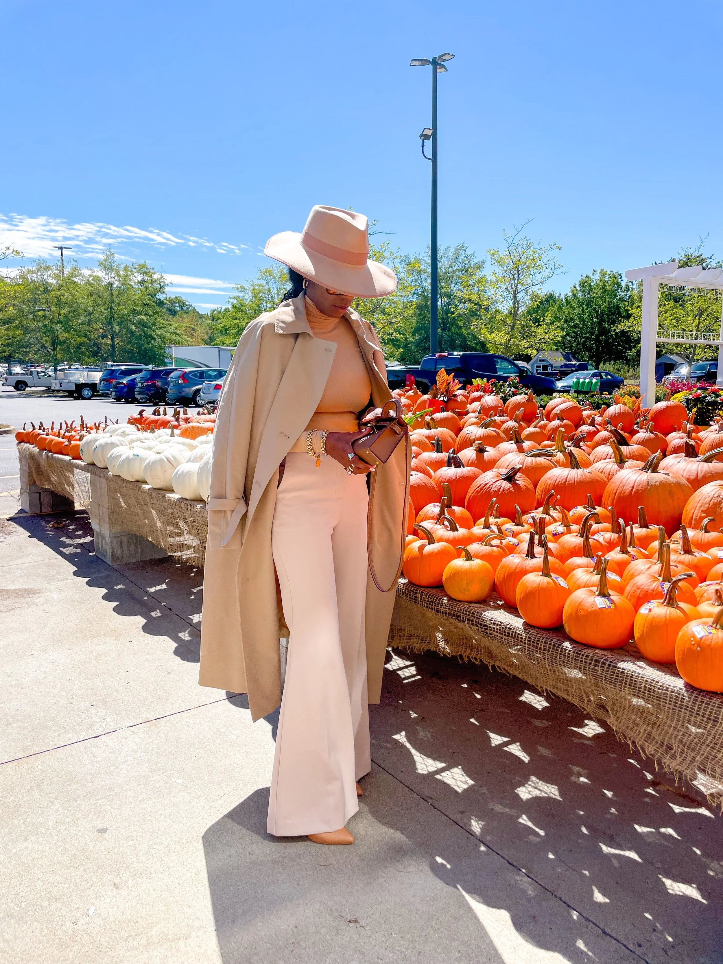 About the look: A camel Fedora/rancher style, a camel turtleneck bodysuit and tan high- waist flared pants and camel boots and a camel/tan trench-coat. Bag: Lily&Bean.